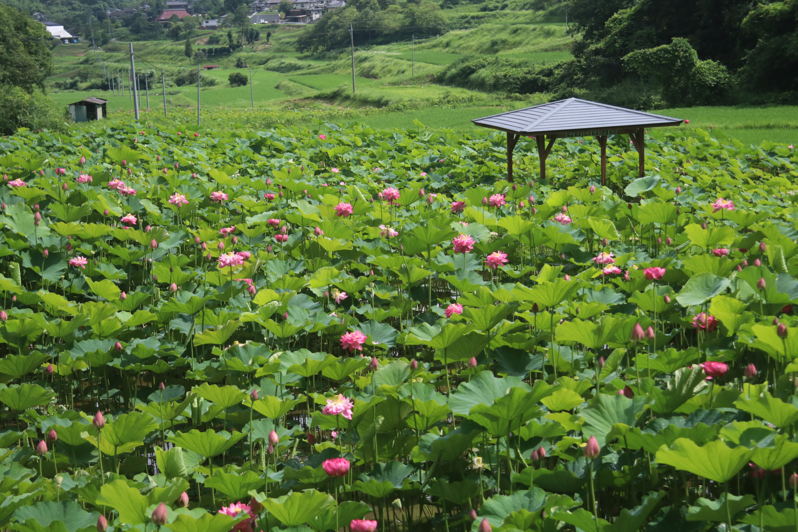 自然豊かな環境で、美しいハスの花と里山の風景を楽しめる癒しのスポットです。