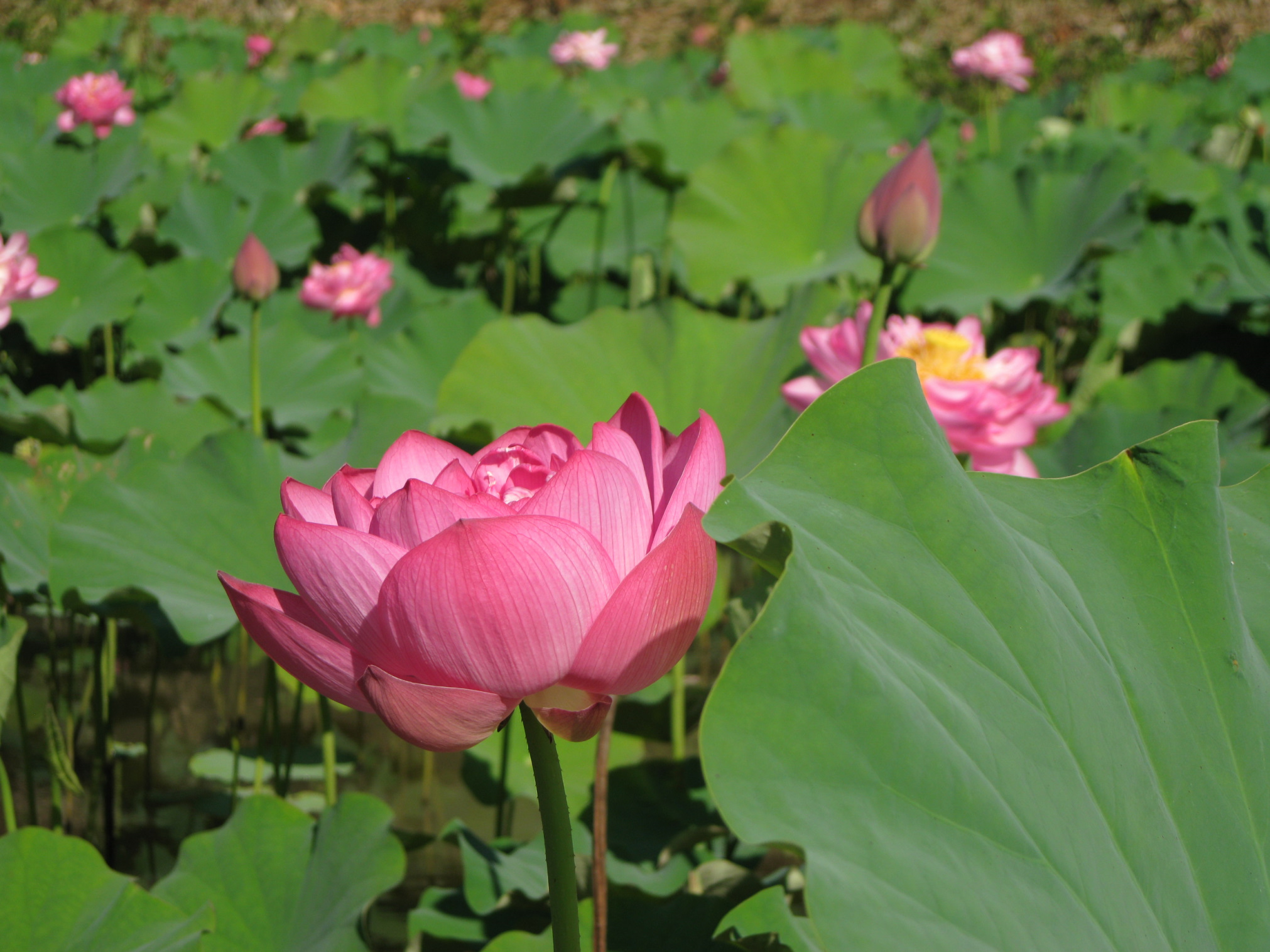約60アールの敷地では毎年7月~8月にかけて、白やピンクの美しいハスの花が一面に咲き誇ります。